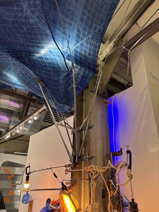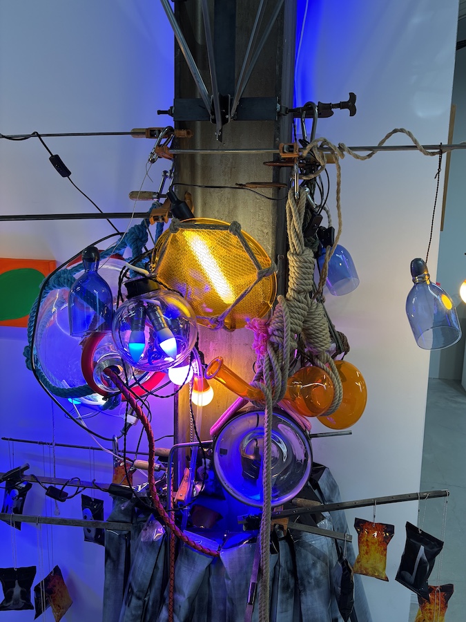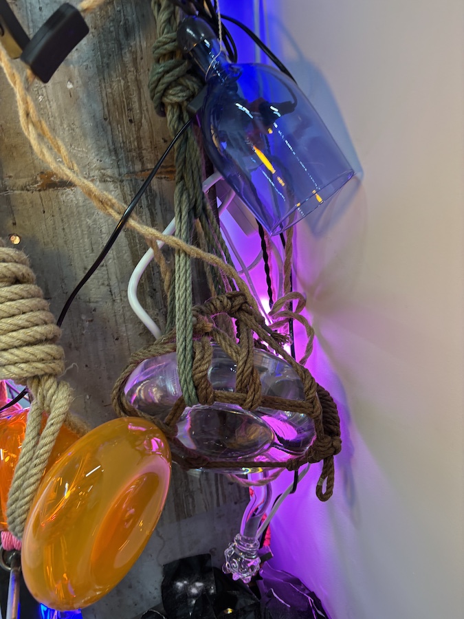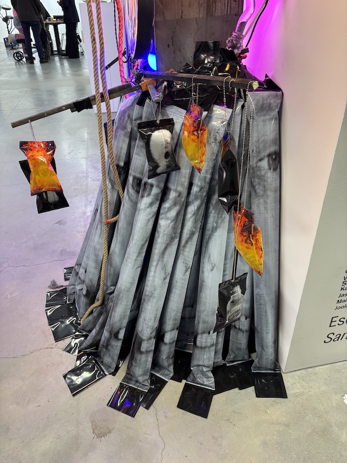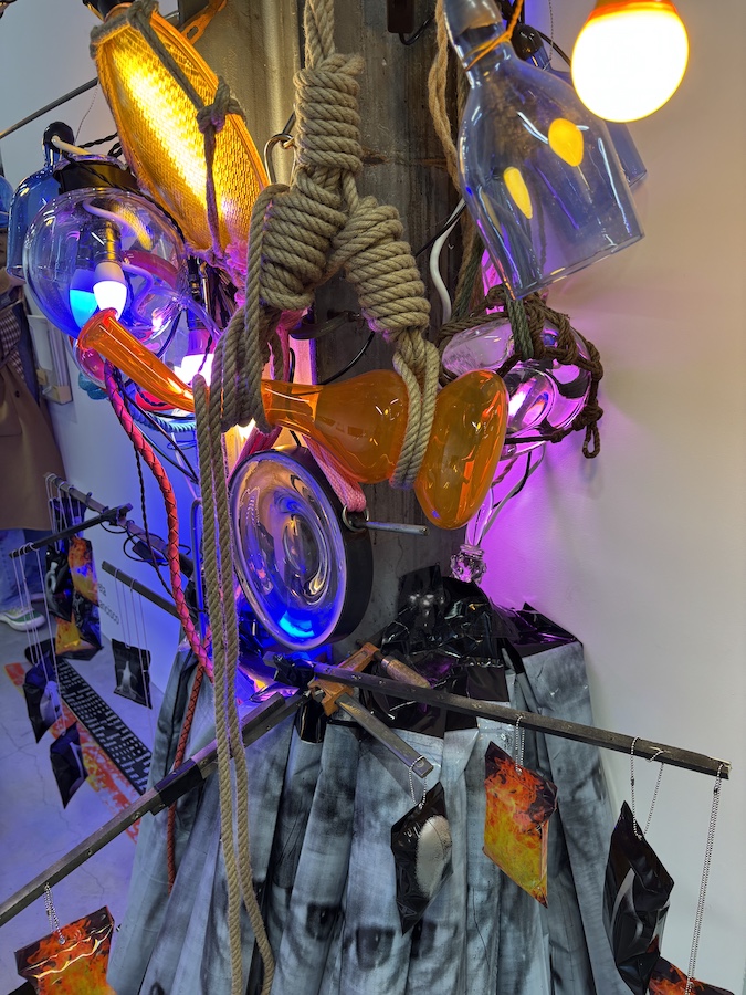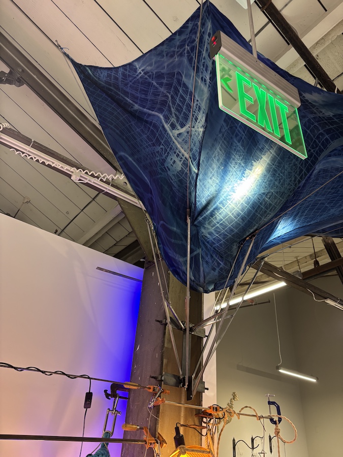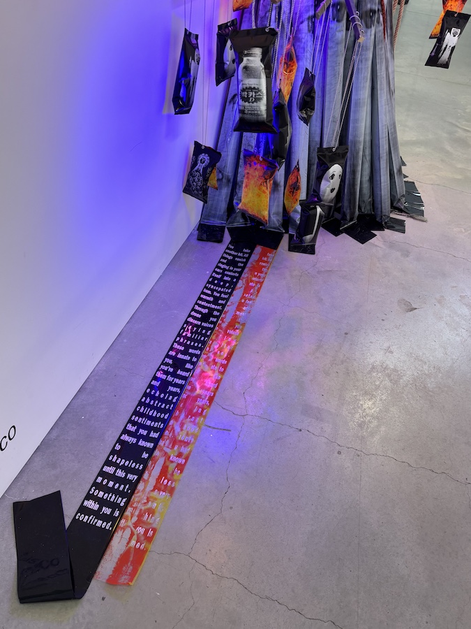 cyanotype on satin, steel; "too high. too die," found objects, glass, leather, light, rope, steel; thermal transfer print on polyethylene, ball chain + edition of 100 unique photocopied & stamped prints