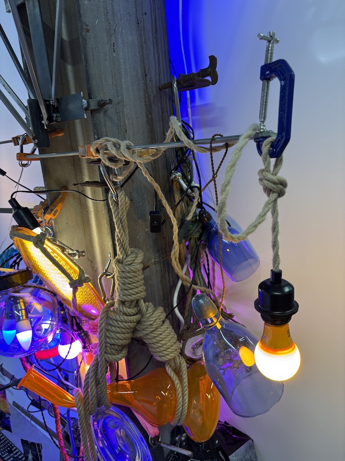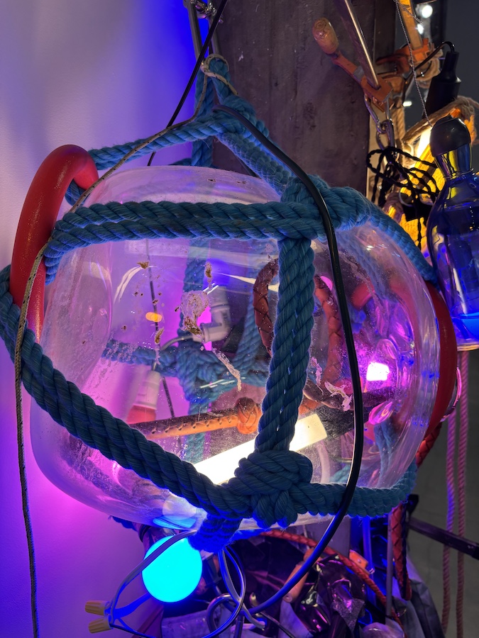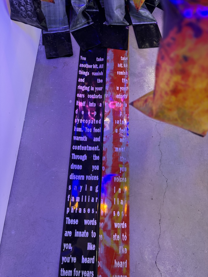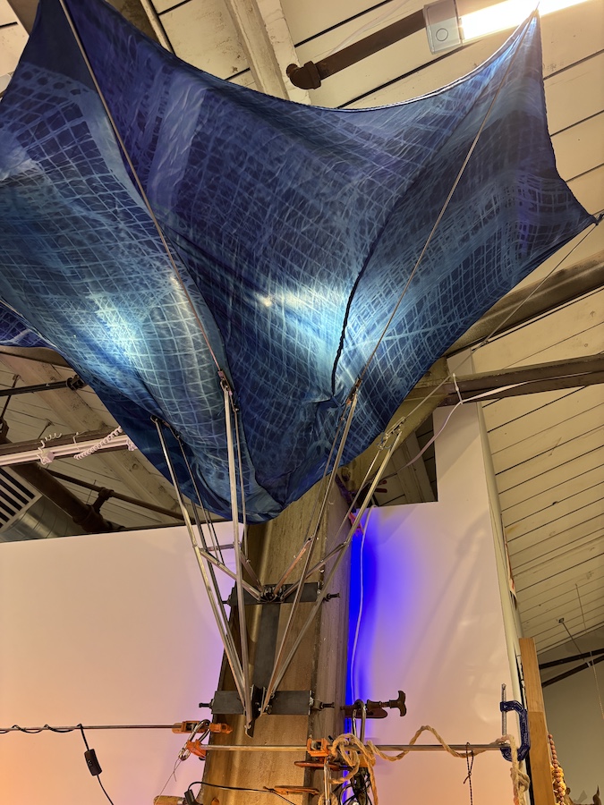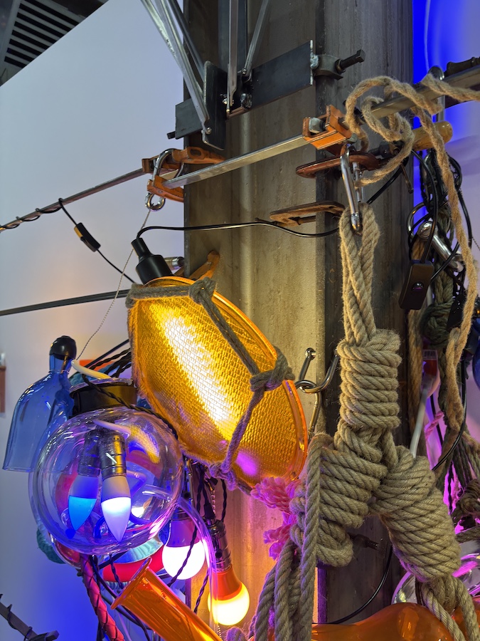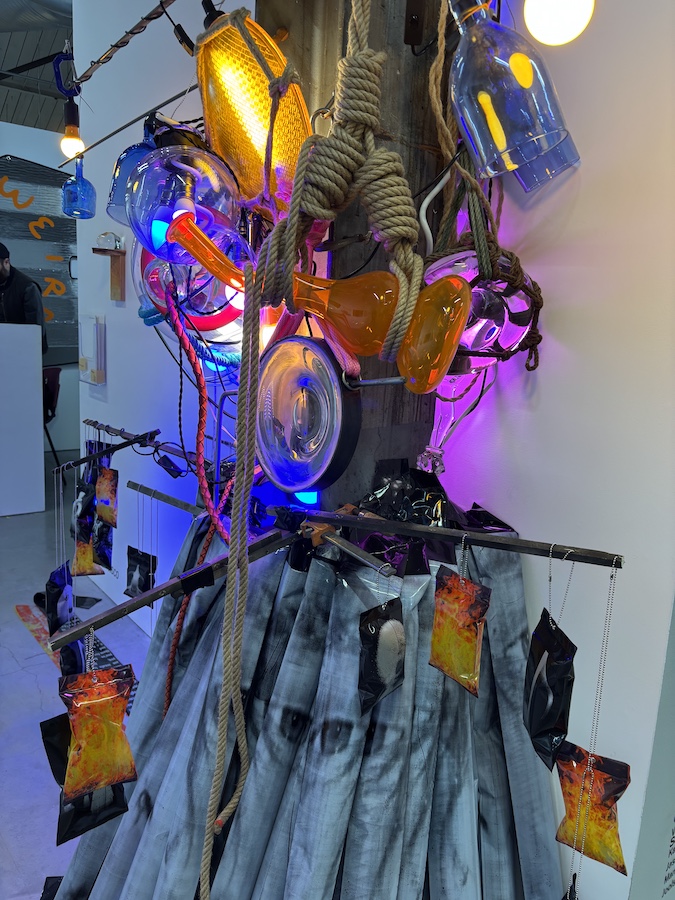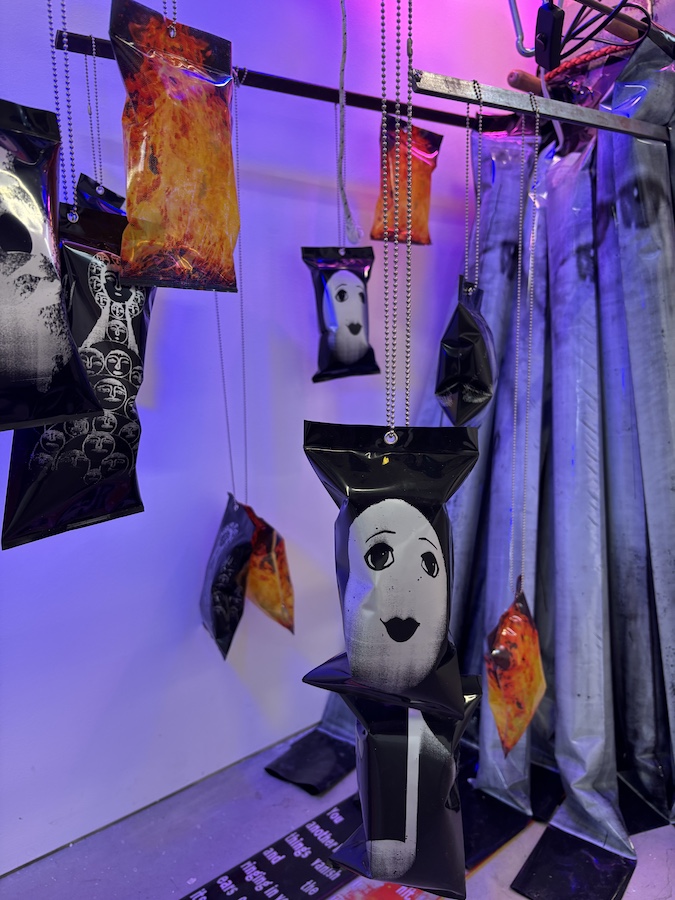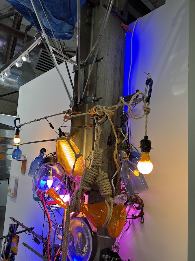 cyanotype on satin, steel; "too high. too die," found objects, glass, leather, light, rope, steel; thermal transfer print on polyethylene, ball chain + edition of 100 unique photocopied & stamped prints
