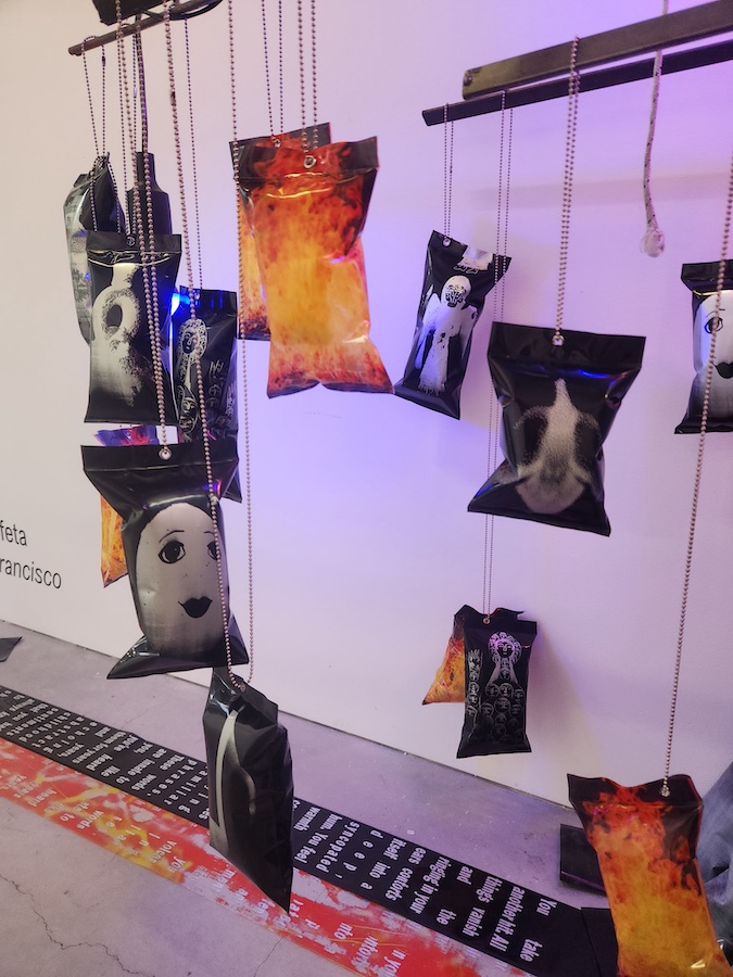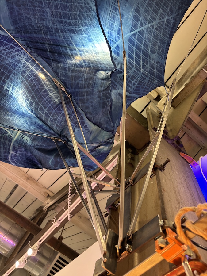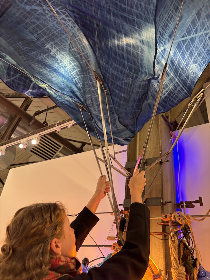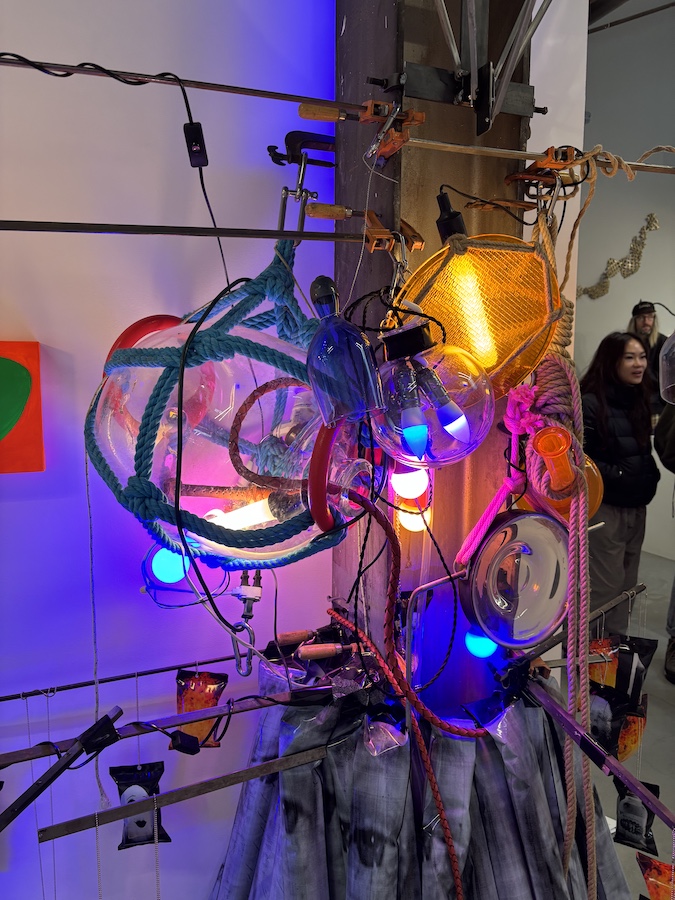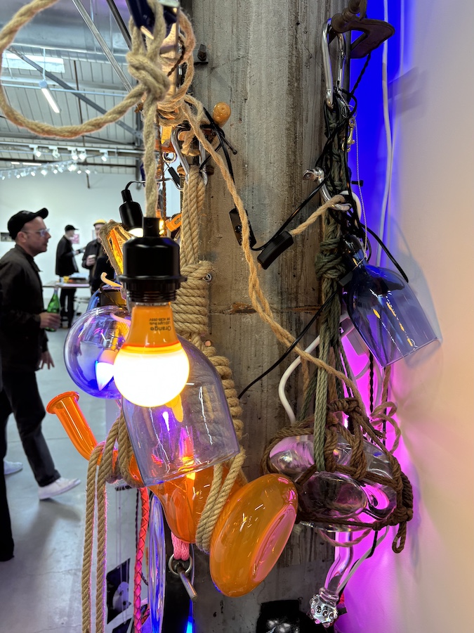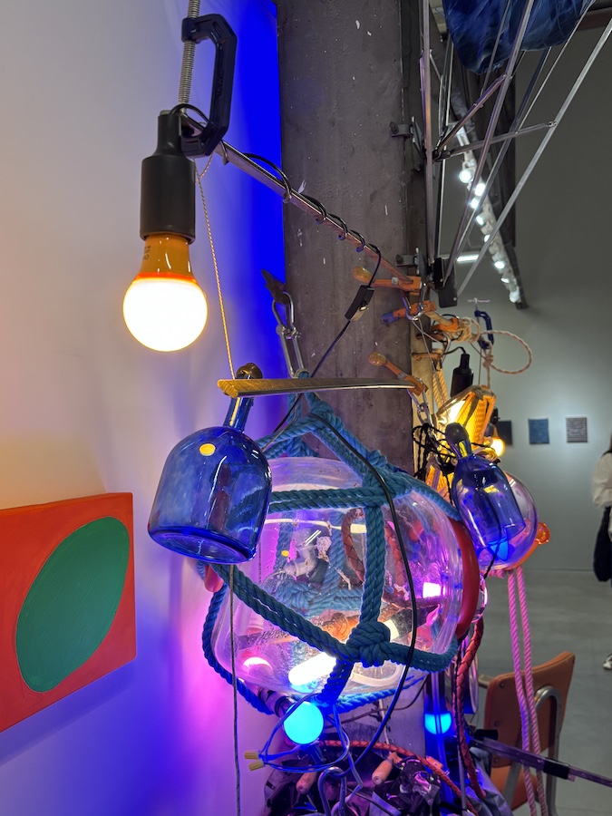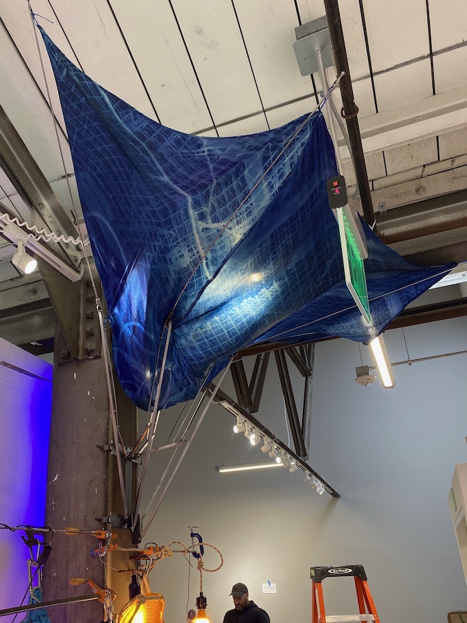 cyanotype on satin, steel; "too high. too die," found objects, glass, leather, light, rope, steel; thermal transfer print on polyethylene, ball chain + edition of 100 unique photocopied & stamped prints