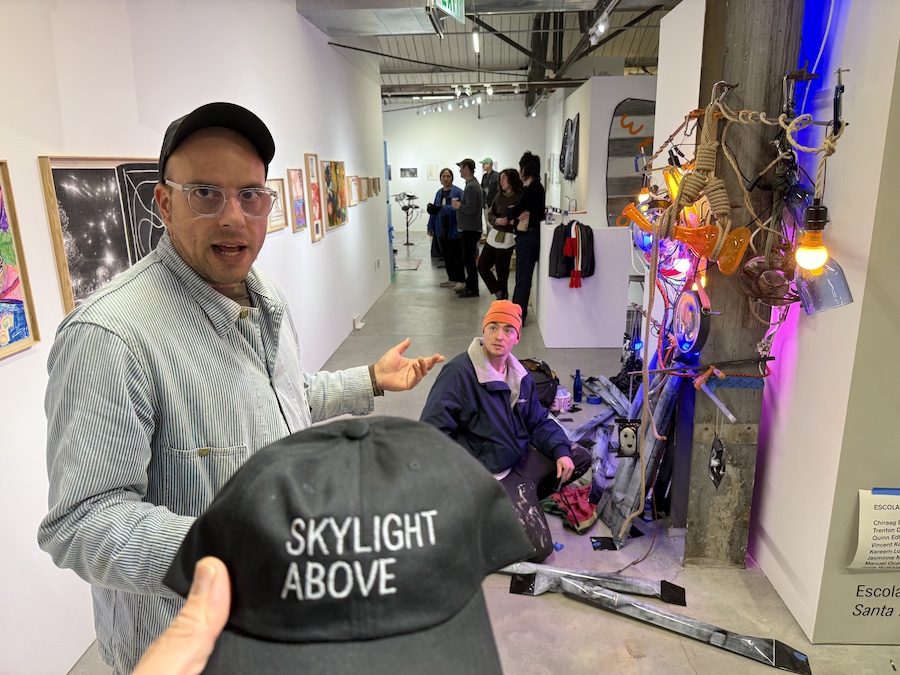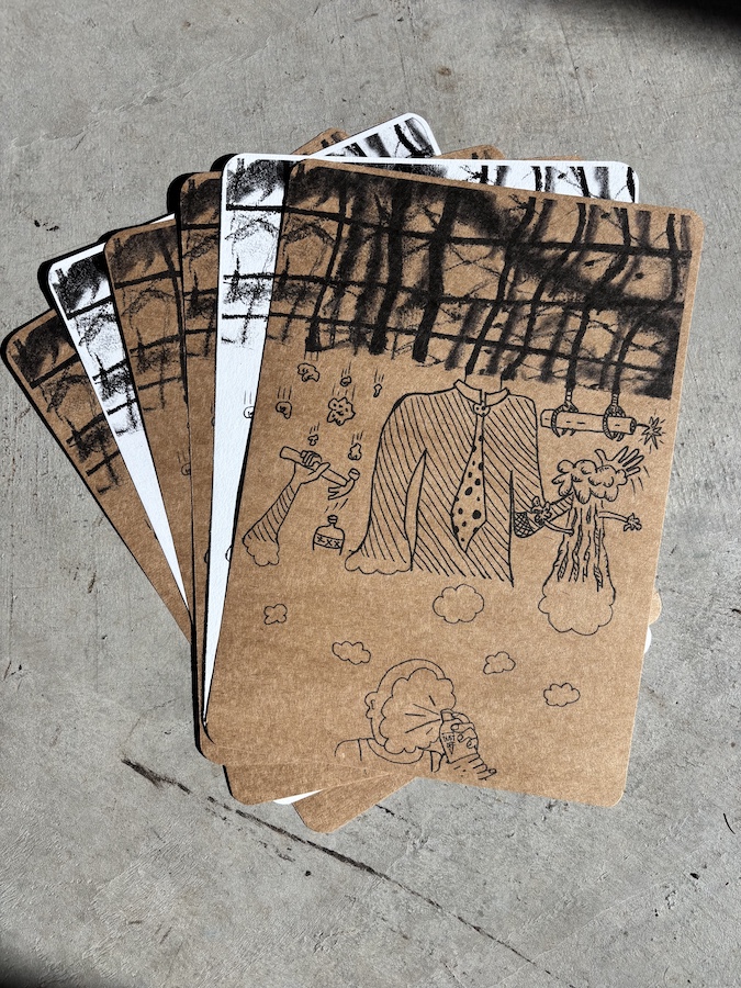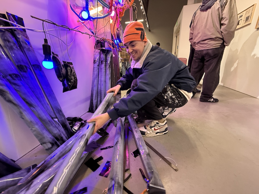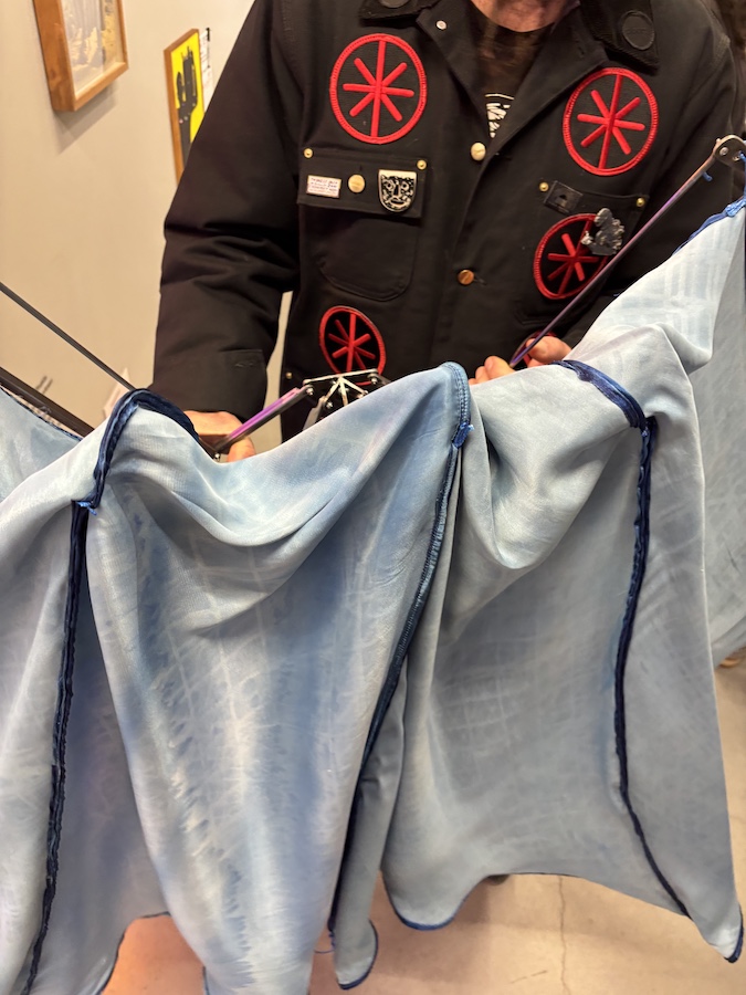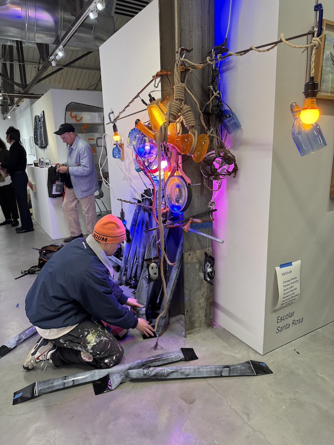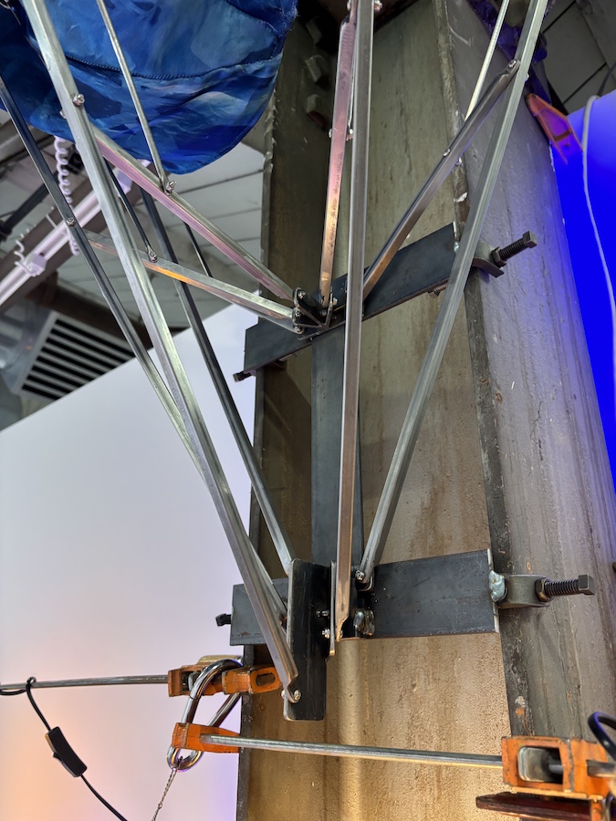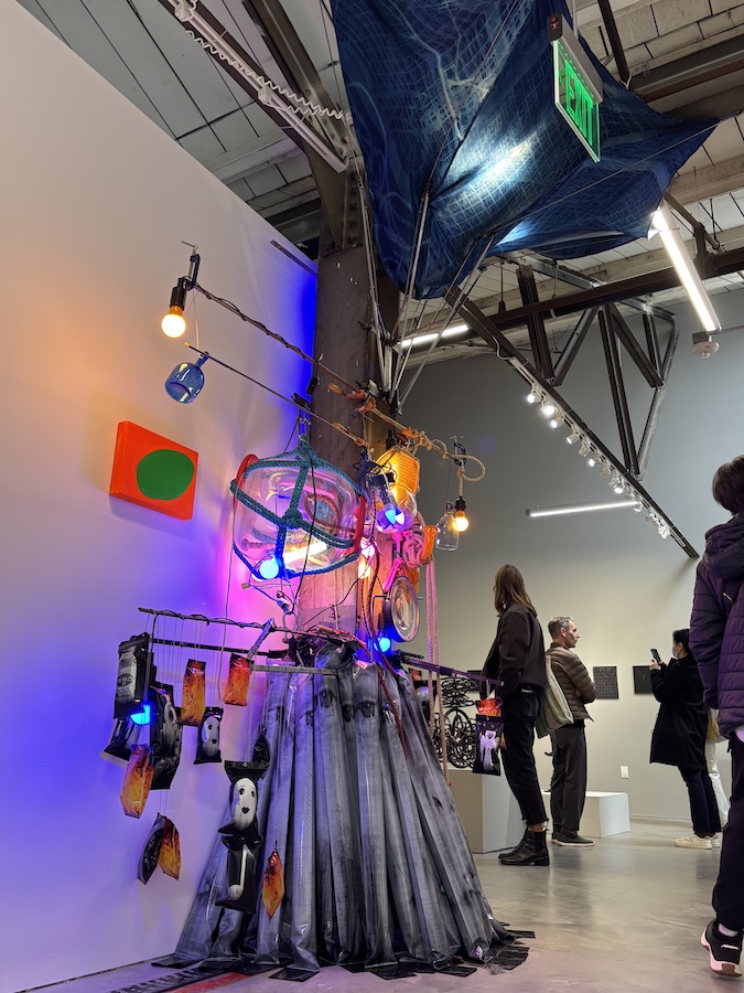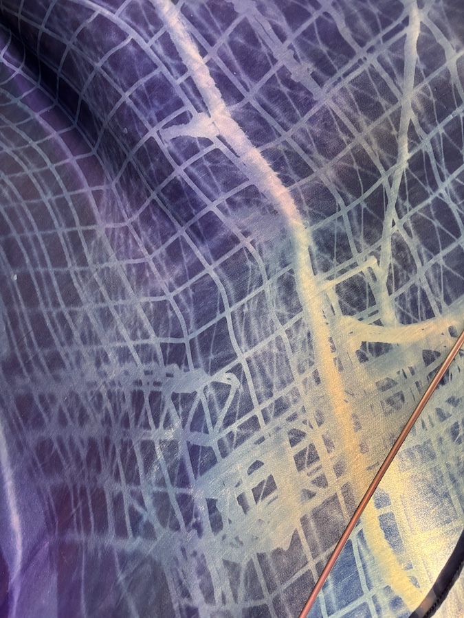 cyanotype on satin, steel; "too high. too die," found objects, glass, leather, light, rope, steel; thermal transfer print on polyethylene, ball chain + edition of 100 unique photocopied & stamped prints